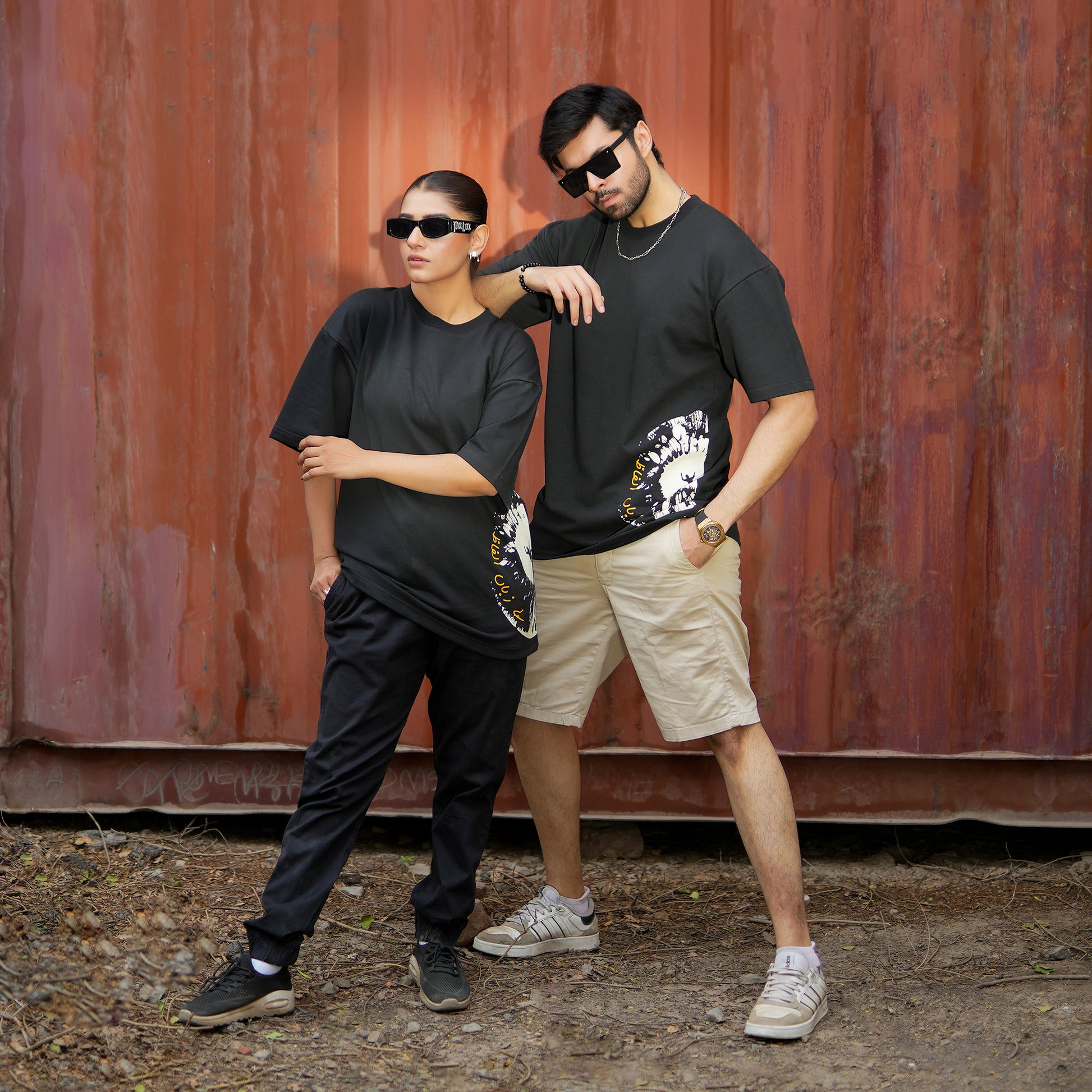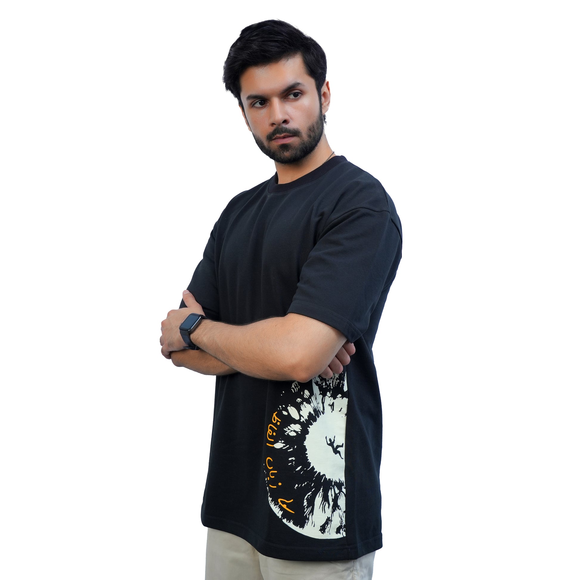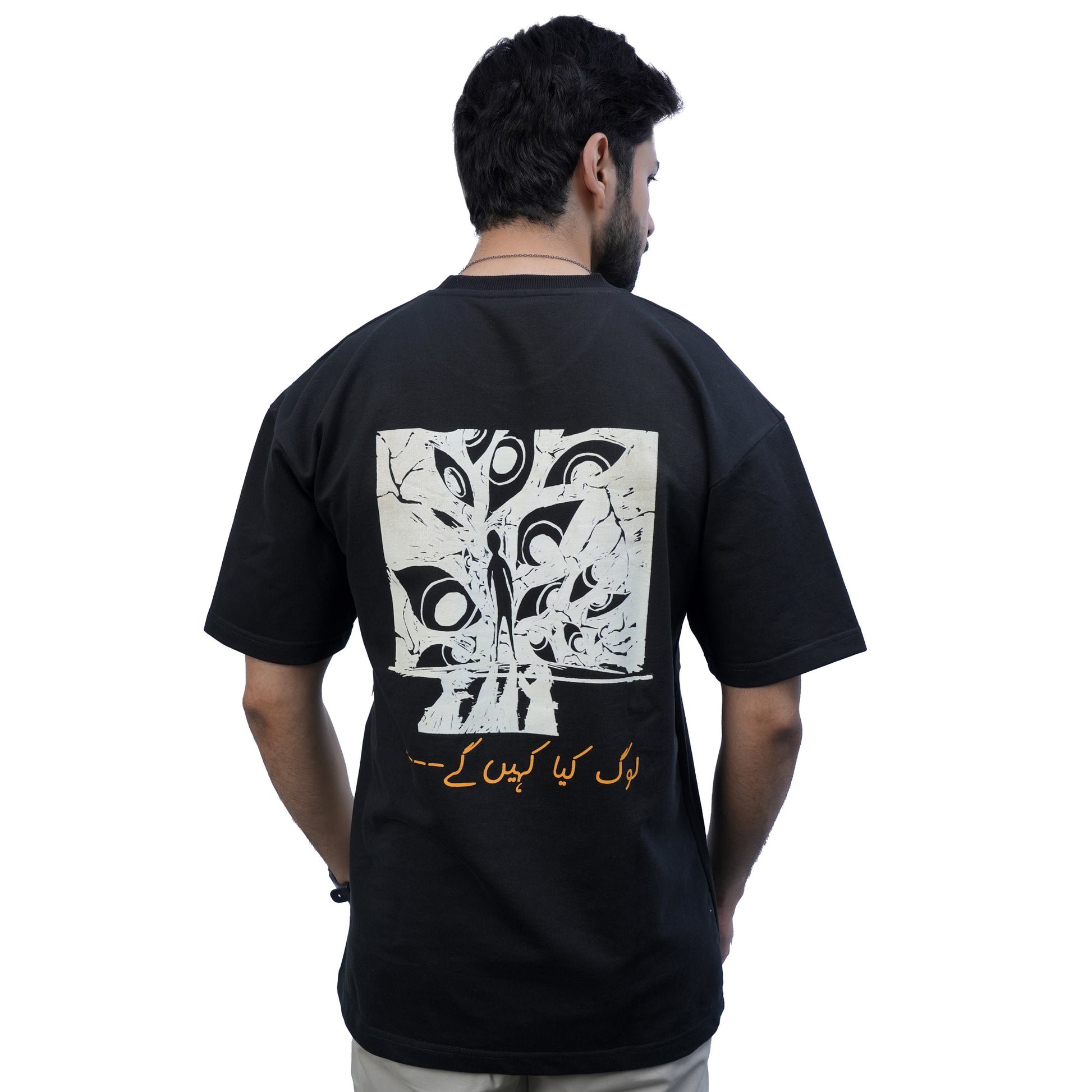 Crafted from premium, substantial terry fabric, this tee in deep black offers textured comfort and a profound backdrop for a powerful narrative. The back features a striking, intricate screen print of abstract forms and a lone figure, complemented by the evocative Urdu script ("لوگ کیا کہیں گے؟"). The front carries a continuation of this artistic expression with a complementary screen print. This is more than apparel; it's a statement for those who dare to express the unspoken.